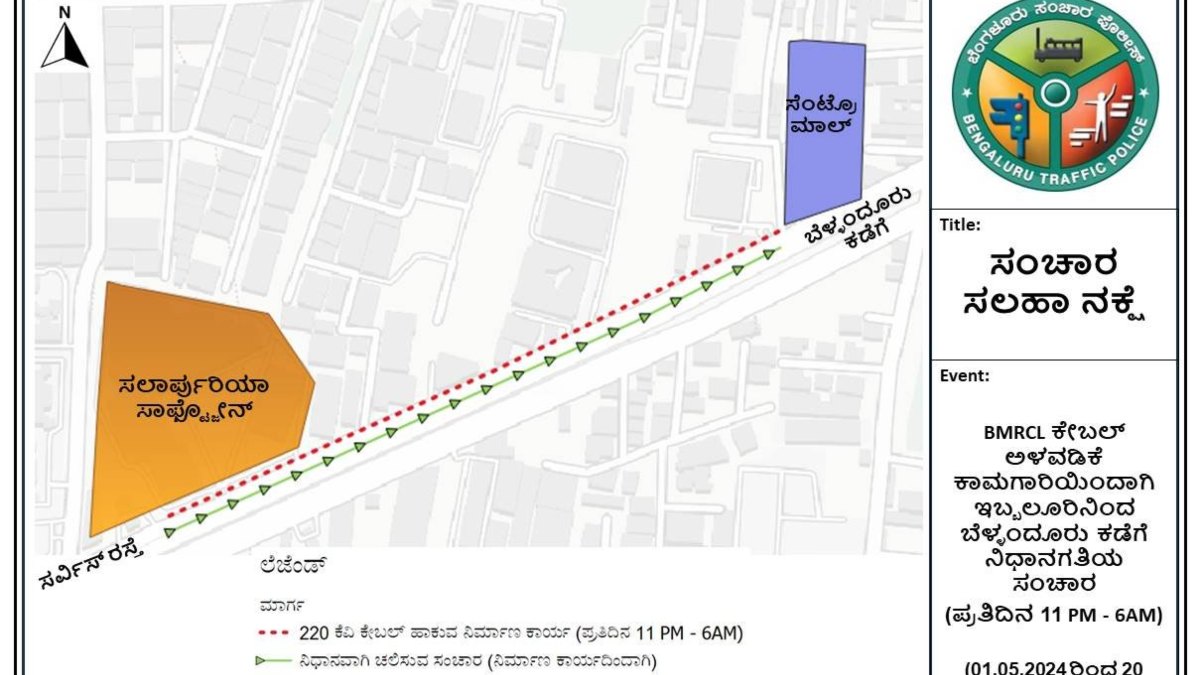 ಇಬ್ಬಲೂರು ಸರ್ವಿಸ್ ರಸ್ತೆಯಲ್ಲಿ ಸಲಾರ್ಪುರಿಯಾ ಸಾಫ್ಟ್ ಝೋನ್ನಿಂದ ಬೆಳ್ಳಂದೂರಿನ ಸೆಂಟ್ರೊ ಮಾಲ್ ಕಡೆಗೆ ಬಿಎಂಆರ್ಸಿಎಲ್ ಕಾಮಗಾರಿ ನಡೆಸಲಿದೆ ಎಂದು ಪ್ರಕಟಣೆ ತಿಳಿಸಿದೆ. 620 ಮೀಟರ್ ಉದ್ದದ ರಸ್ತೆಯಲ್ಲಿ ಅಡಚಣೆ ಉಂಟಾಗುವುದರಿಂದ ಮುಖ್ಯ ರಸ್ತೆಯಲ್ಲಿ ನಿಧಾನಗತಿಯ ಸಂಚಾರಕ್ಕೆ ಕಾರಣವಾಗಬಹುದು, ದಟ್ಟಣೆ ಹೆಚ್ಚಿರುವ ದಿನದಲ್ಲಿ ಯಾವುದೇ ದೊಡ್ಡ ದಟ್ಟಣೆ ಉಂಟಾಗುವುದಿಲ್ಲ ಎಂದು ಸಂಚಾರ ಪೊಲೀಸರು ತಿಳಿಸಿದ್ದಾರೆ.