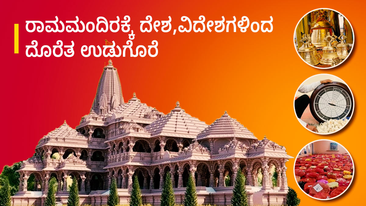 108 ಅಡಿ ಉದ್ದದ ಅಗರಬತ್ತಿ, 2,100 ಕೆಜಿ ಗಂಟೆ, 1,100 ಕೆಜಿ ತೂಕದ ದೈತ್ಯ ದೀಪ, ಚಿನ್ನದ ಪಾದರಕ್ಷೆಗಳು, 10 ಅಡಿ ಎತ್ತರದ ಲಾಕ್ ಮತ್ತು ಕೀ, ಎಂಟು ದೇಶಗಳಲ್ಲಿ ಏಕಕಾಲದಲ್ಲಿ ಸಮಯವನ್ನು ಸೂಚಿಸುವ ಗಡಿಯಾರ ಹೀಗೆ ಹಲವಾರು ವಿಶೇಷ ಉಡುಗೊರೆಗಳನ್ನು ರಾಮಮಂದಿರಕ್ಕೆ ನೀಡಲಾಗಿದೆ. ಈ ಬಗ್ಗೆ ಅಧಿಕ ಮಾಹಿತಿ ಇಲ್ಲಿದೆ ಮುಂದೆ ಓದಿ...