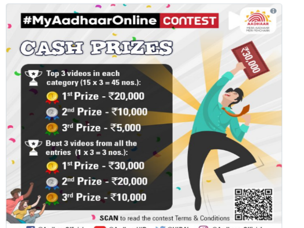 ಯುಐಡಿಎಐ My Aadhaar Online ಸ್ಪರ್ಧೆ ಶುರು ಮಾಡಿದೆ. ಆಧಾರ್ ಕಾರ್ಡ್ ನೀಡುವ ಸೇವೆಯಲ್ಲಿ ಒಂದನ್ನು ಆಯ್ದುಕೊಂಡು ಅನಿಮೇಟೆಡ್ ಟ್ಯುಟೋರಿಯಲ್ ವಿಡಿಯೋ ಸಿದ್ಧಪಡಿಸಬೇಕು. ಮುಖ್ಯ ವಿಷ್ಯಯವೆಂದರೆ ಹಿಂದಿ ಮತ್ತು ಇಂಗ್ಲೀಷ್ ನಲ್ಲಿ ಮಾತ್ರ ಅನಿಮೇಟೆಡ್ ವಿಡಿಯೋ ಮಾಡಬೇಕು. ಸ್ಪರ್ಧೆಯಲ್ಲಿ 48 ಮಂದಿಯನ್ನು ವಿಜೇತರೆಂದು ಆಯ್ಕೆ ಮಾಡಲಾಗುವುದು. 15 ವಿಭಾಗಗಳನ್ನಾಗಿ ವಿಂಗಡಿಸಿದ್ದು, ಅದರಲ್ಲಿ ಮೂರು ಪ್ರಮುಖ ವಿಡಿಯೋವನ್ನು ಅಂತಿಮ ಸುತ್ತಿಗೆ ಆಯ್ಕೆ ಮಾಡಲಾಗುವುದು. ಮೊದಲ ವಿಜೇತ ವಿಡಿಯೋಕ್ಕೆ 20 ಸಾವಿರ ರೂಪಾಯಿ ನೀಡಲಾಗುವುದು. ಎರಡನೇ ವಿಜೇತರಿಗೆ 10 ಸಾವಿರ ಹಾಗೂ ಮೂರನೇ ವಿಜೇತರಿಗೆ 5 ಸಾವಿರ ರೂಪಾಯಿ ಬಹುಮಾನ ನೀಡಲಾಗುವುದು.